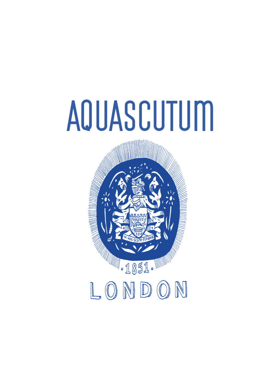 アクアスキュータムのクレストの構成は6つ。まずは雲型の曲線を表した上部の白と、雨の水滴模様の下部の青、そして卓越を表す冠で成り立つ盾のシールド・オブ・アームズ。ふたつめは、盾の上に配置された騎士のヘルメット。そして、ヘルメットからマントが吊される際の繋ぎ役の青と白の紐が三つ目。肩を守る役割りである四つ目のマントは、戦いで騎士に切られたイメージを表現しており、ギザギザの形状はそんな意味が込められています。英国とスコットランドのメインカラーである赤と黄色のライオンのクレストは、ライオンが持つ小さな赤い剣がロンドン市との友好関係を表現した五つ目の要素。最後のモットーは、ブランド名にちなんだラテン語のフレーズである「IN HOC SCUTO FIDEMUS(イン・ホック・スキュート・フィデムース)」と刻まれ、「私たちは、この盾の中に信念を持つ」の意味が込められています。